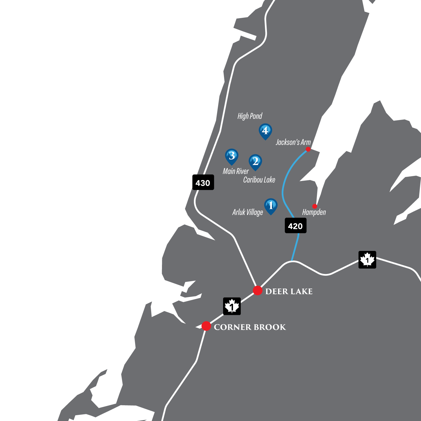 As you can see from the map, you’ll travel the TCH. If headed west, you’ll find Route 420 approximately 45 KM East of Deer Lake. Route 420 will see you travel for 24 KM and then you’ll find the turn off to Taylor’s Brook Road. You’ll see the road signs on the left side of the road where you’ll turn. The Arluk Village is a short 2 KM drive in the plowed access road. All Arluk Guest will enjoy parking at the Arluk Village.